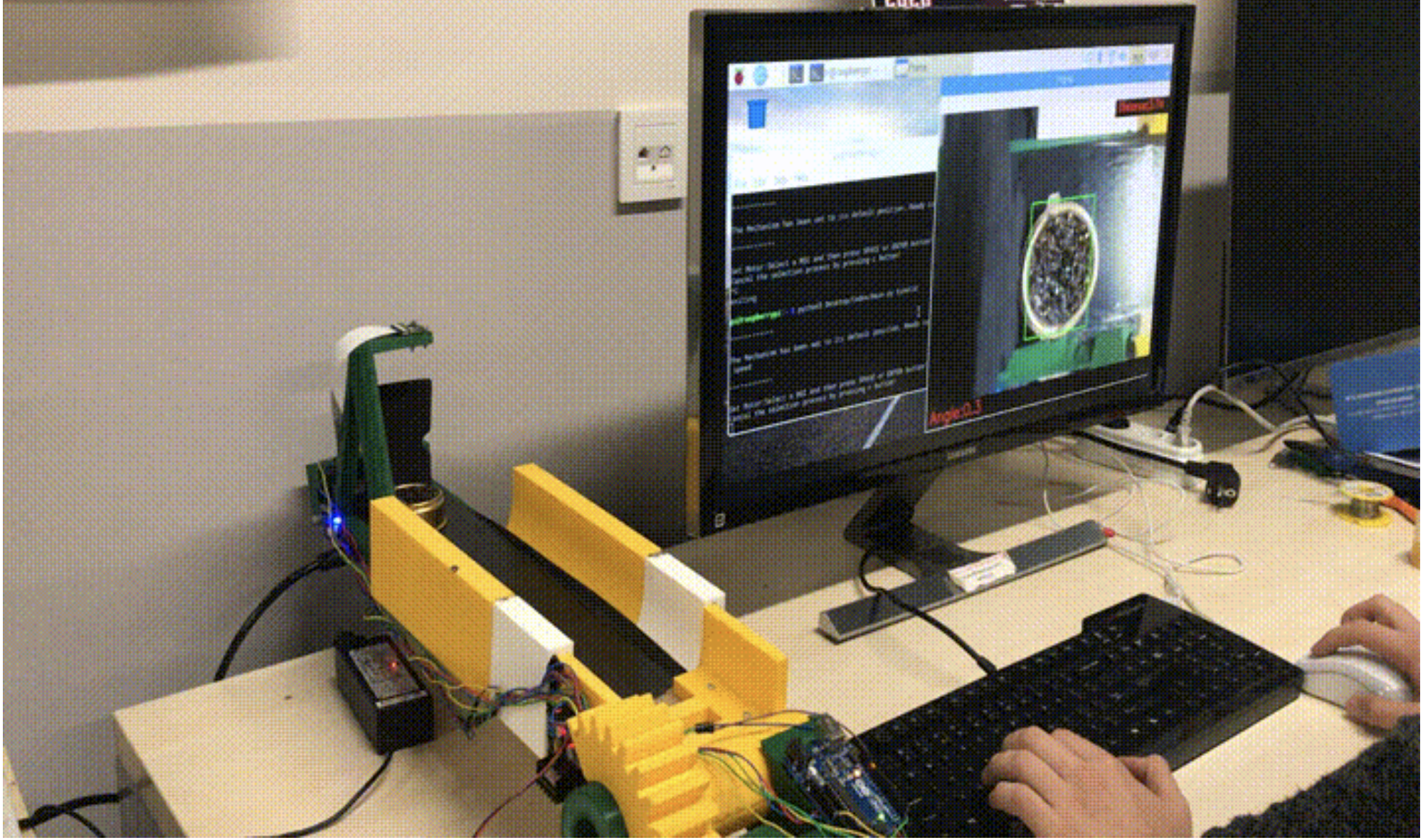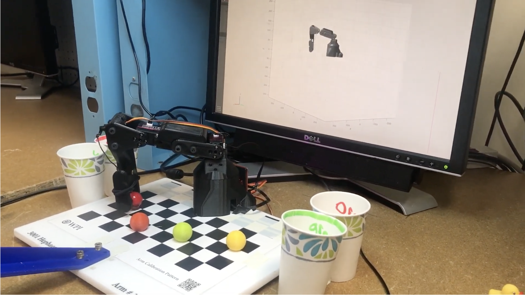 Three-link arm detects balls using computer vision, autonomously picks them, and groups them in bins.
